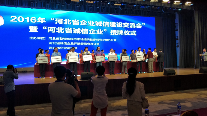 2016年9月22日,由河北省整頓和規(guī)范市場經(jīng)濟秩序領(lǐng)導小組辦公室、河北省誠信企業(yè)評選委員會辦公室、河北省企業(yè)家協(xié)會聯(lián)合主辦并組織的“河北省企業(yè)誠信建設(shè)交流會”暨“河北省誠信企業(yè)”授牌儀式在石家莊市以嶺健康城凱旋門建國大酒店隆重舉行。