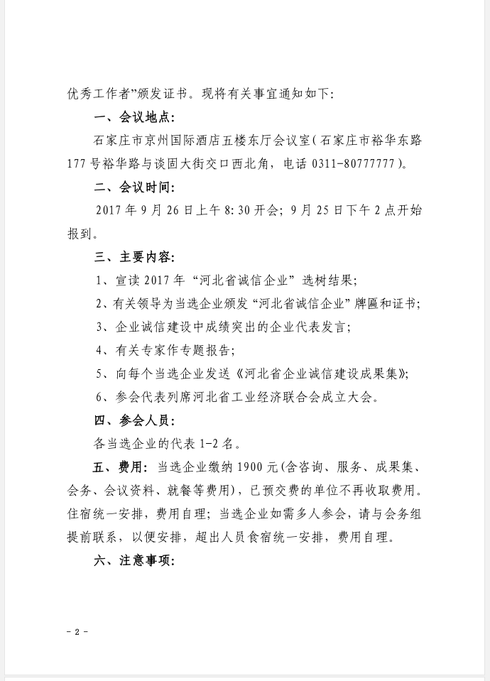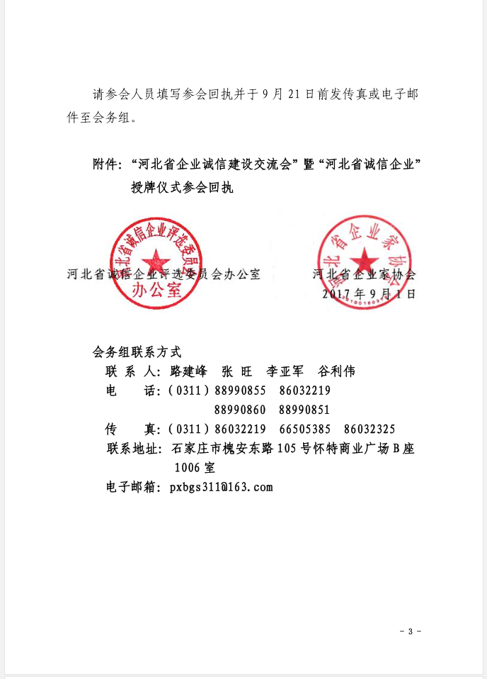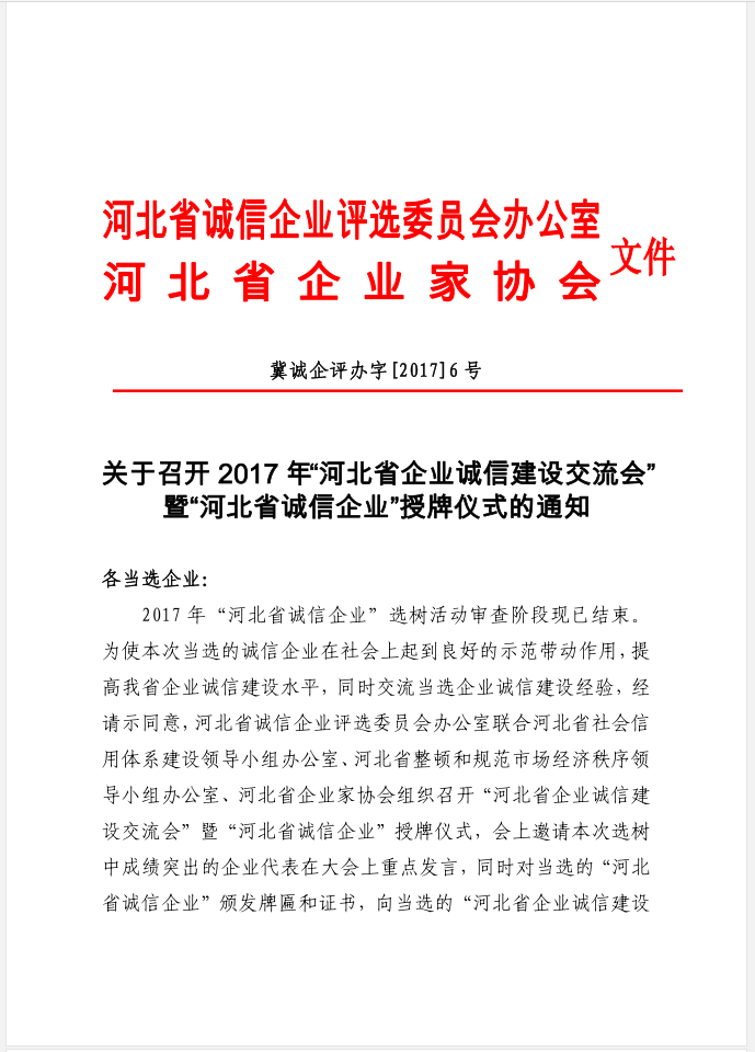 文件下載:關(guān)于召開2017年“河北省企業(yè)誠信建設(shè)交流會”暨“河北省誠信企業(yè)”授牌儀式的通知