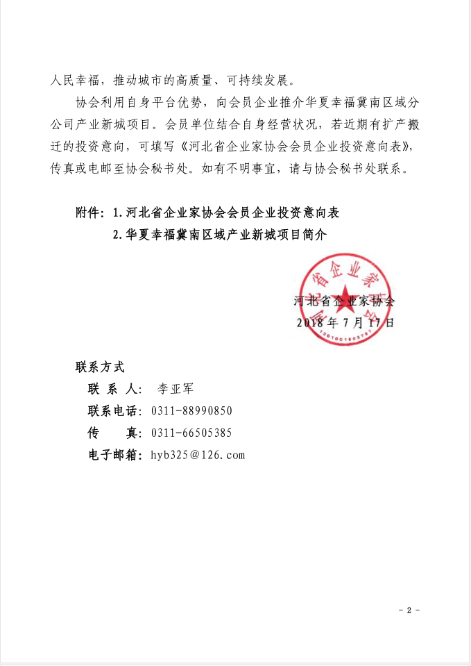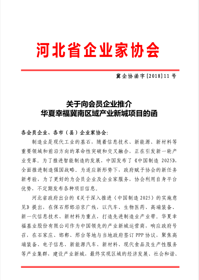 關(guān)于向會(huì)員企業(yè)推介 華夏幸福冀南區(qū)域產(chǎn)業(yè)新城項(xiàng)目的函