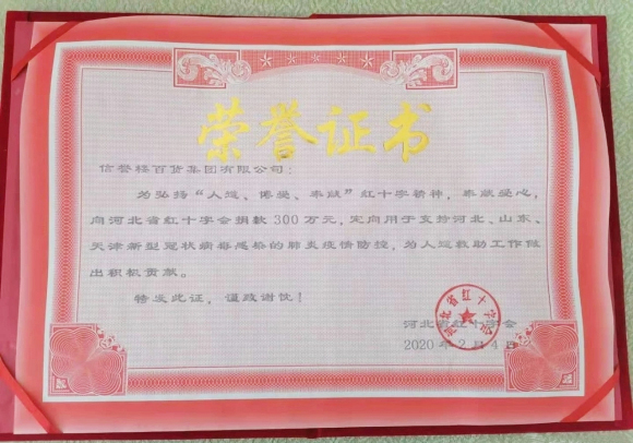 2月4日,信譽(yù)樓百貨集團(tuán)有限公司通過河北省紅十字會(huì)捐贈(zèng)防控資金300萬,定向用于支持新型冠狀病毒感染肺炎疫情防控。