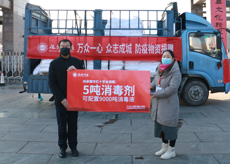 2月3日,向承德市、承德縣紅十字基金會(huì)捐贈(zèng)50萬元現(xiàn)金及7噸固態(tài)消毒劑(可配制為消毒液12600噸)。其中,定向捐贈(zèng)承德市防疫資金30萬元及固態(tài)消毒劑5噸,捐贈(zèng)承德縣防疫資金20萬及固態(tài)消毒劑2噸,用于支援家鄉(xiāng)抗擊新型冠狀病毒疫情的斗爭(zhēng)。