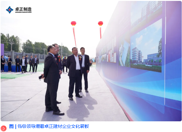 儀式開始前,各位領(lǐng)導(dǎo)通過文化展示區(qū),了解了卓正建筑材料有限公司21年來的發(fā)展歷程,并對(duì)公司過硬的產(chǎn)品質(zhì)量、完善的售后服務(wù)、良好的社會(huì)信譽(yù)給予了高度評(píng)價(jià)。