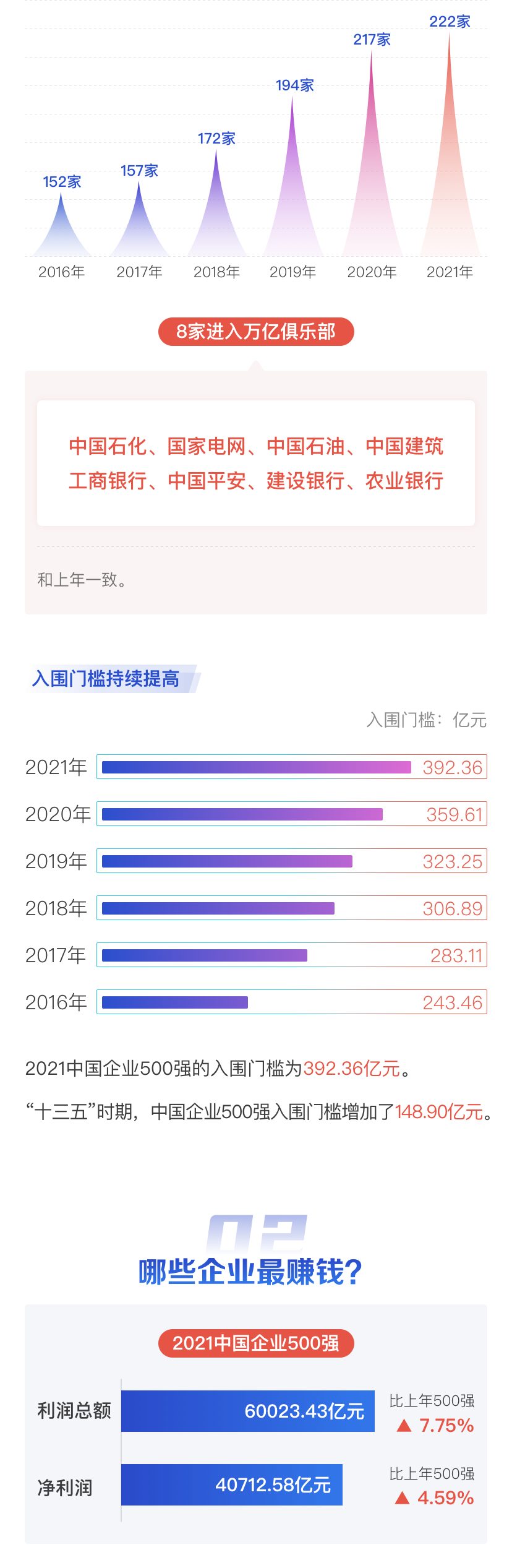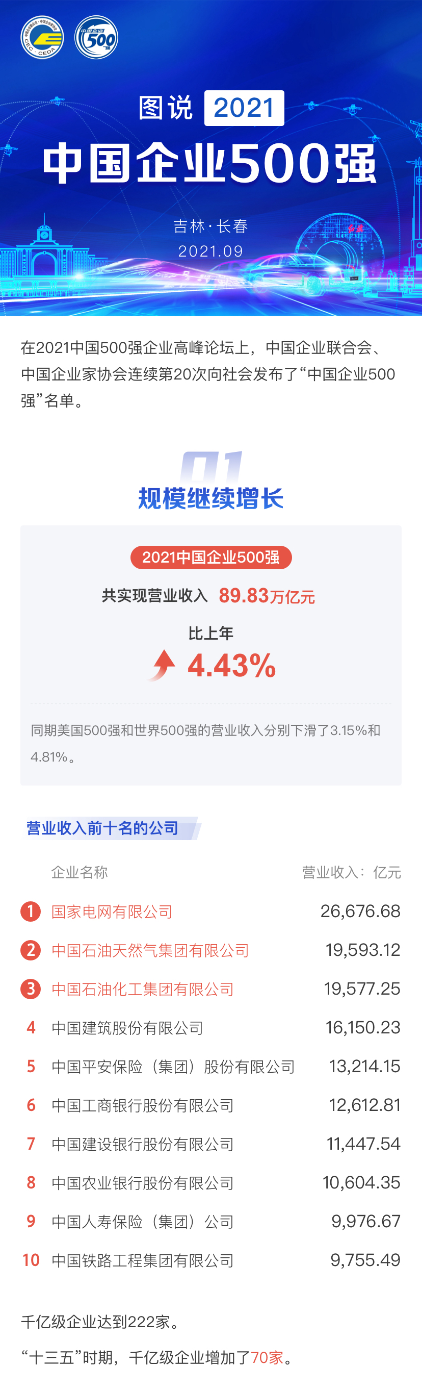 2021中國500強(qiáng)企業(yè)排行榜顯示,上榜500強(qiáng)企業(yè)合計營收為89.83萬億元,同比上年增加了3.81萬億元,增幅為4.43%;500強(qiáng)入圍門檻為392.36億元,同比上年提高了3.2.75億元。