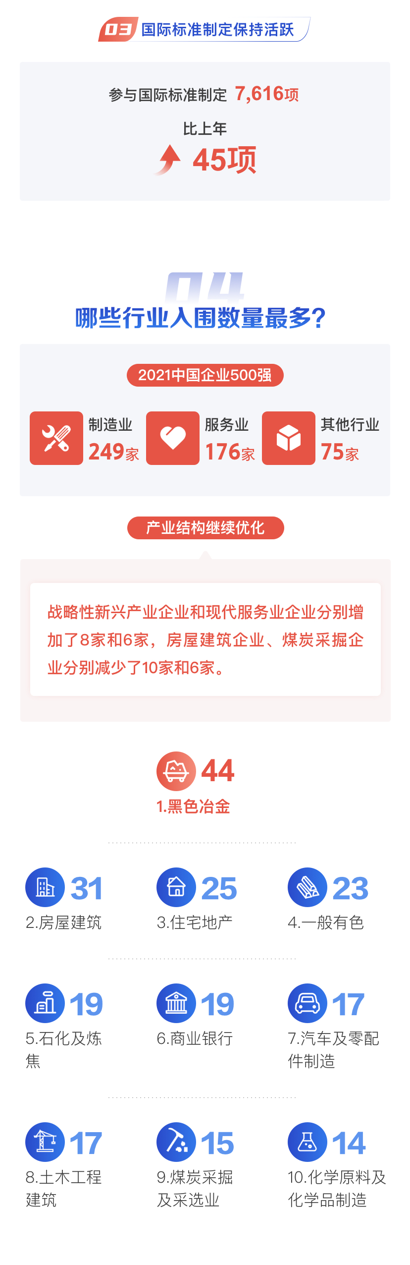 從行業(yè)分布來看,全國500強(qiáng)企業(yè)名單中有249家制造業(yè)企業(yè),同比上年增加11家;有176家服務(wù)業(yè)企業(yè),同比上年減少5家;有75家其他行業(yè)企業(yè),同比上年減少6家。整體來看,500強(qiáng)名單中戰(zhàn)略新興產(chǎn)業(yè)企業(yè)越來越大,傳統(tǒng)產(chǎn)業(yè)企業(yè)越來越少。