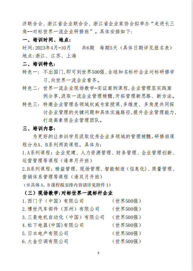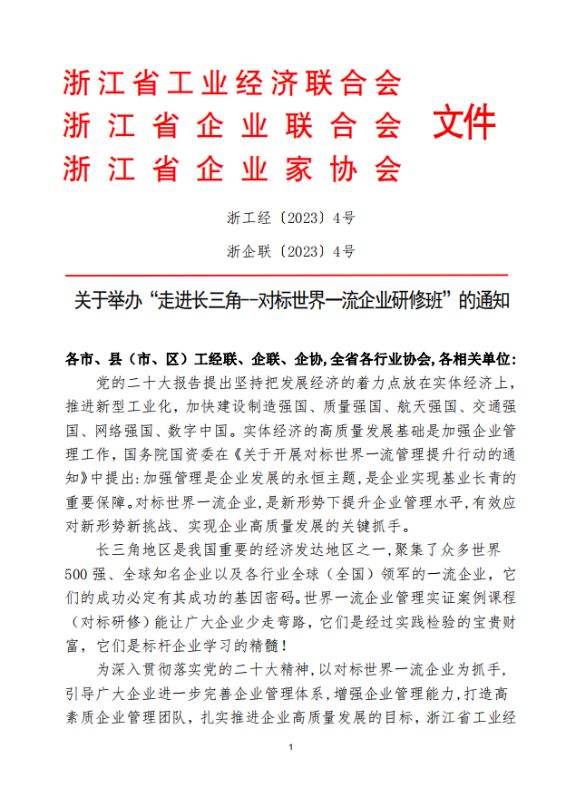 為深入貫徹落實(shí)黨的二十大精神,引導(dǎo)廣大企業(yè)進(jìn)一步完善企業(yè)管理系統(tǒng),增強(qiáng)企業(yè)管理能力,打造高素質(zhì)企業(yè)管理團(tuán)隊(duì),扎實(shí)推進(jìn)企業(yè)高質(zhì)量發(fā)展的目標(biāo)。浙江省企業(yè)聯(lián)合會(huì)、企業(yè)家協(xié)會(huì)組織舉辦《走進(jìn)長(zhǎng)三角——對(duì)標(biāo)世界一流企業(yè)研修班》(詳情請(qǐng)見(jiàn)所附文件),以對(duì)標(biāo)世界一流企業(yè)為抓手,引領(lǐng)帶動(dòng)各地企業(yè)共同發(fā)展。