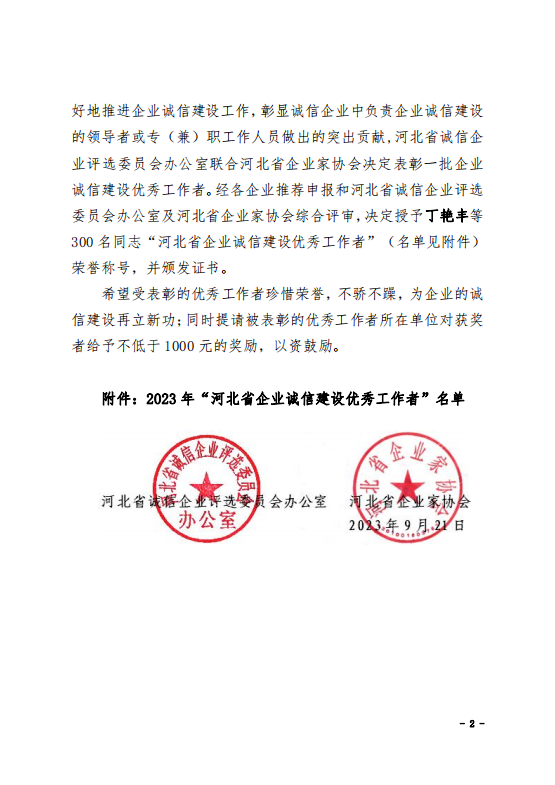 2023年“河北省企業(yè)誠信建設(shè)優(yōu)秀工作者”名單